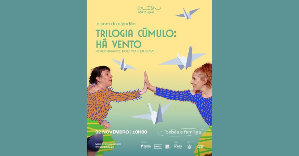 O último espetáculo está marcado para a manhã de 2 de novembro: “Trilogia Cúmulos – Há Vento”. Uma performance poética e musical para bebés, crianças, famílias e demais ouvidos curiosos, que elege a liberdade do voo, da migração, dos corpos e da vontade como elemento poético. Um espaço de liberdade para a palavra poética e para a expressão sonora, inspirado nos cataventos, ao encontro do outro.