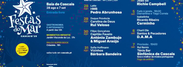 De 28 de agosto a 7 de setembro de 2025, as Festas do Mar regressam à Baía de Cascais, entre o Jardim Visconde da Luz e a Cidadela, com oito noites de música, gastronomia, artesanato e animação para todas as idades.