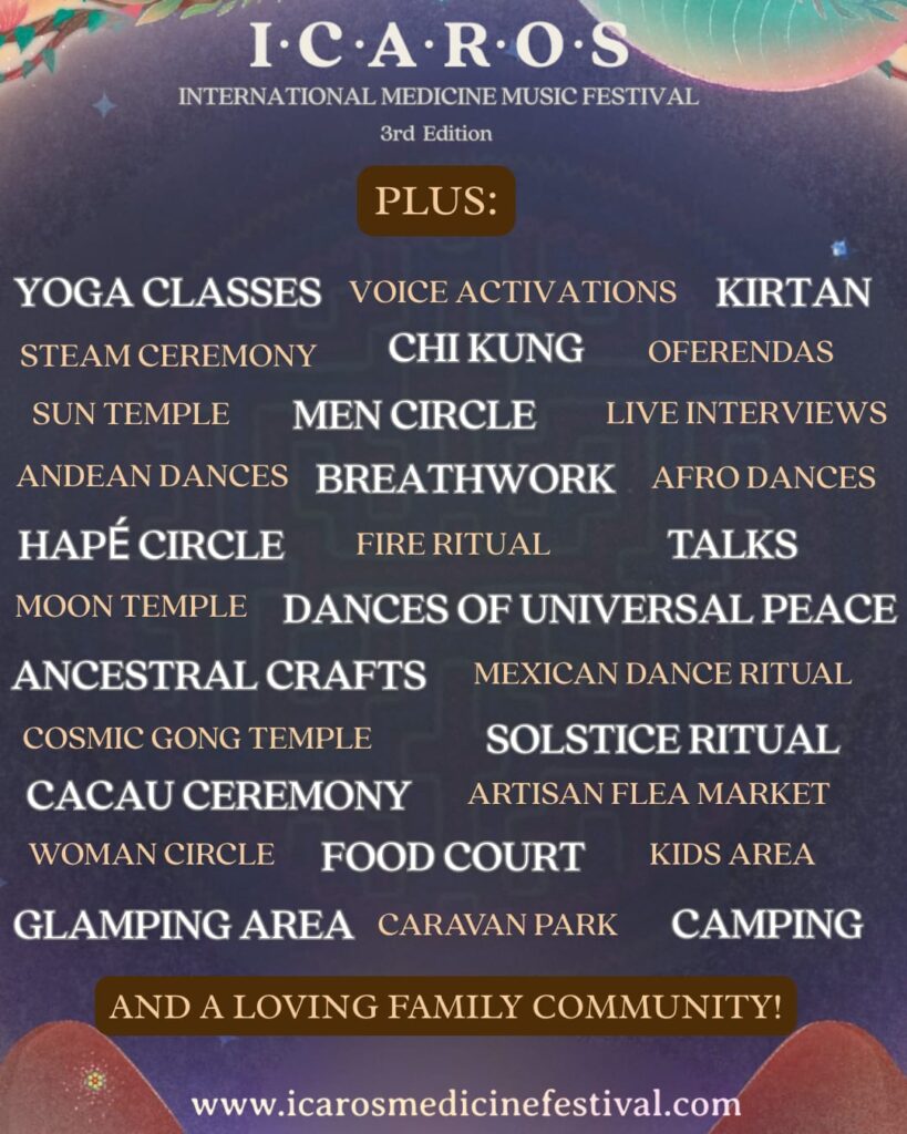 Mais do que um evento, o Festival ÍCAROS é uma experiência de reconexão com a terra, o corpo e o espírito. Livre de álcool, de música digital e de distrações, oferece um ambiente seguro e transformador, onde cada detalhe — do silêncio à música, da comida ao espaço — é parte de um ritual coletivo.