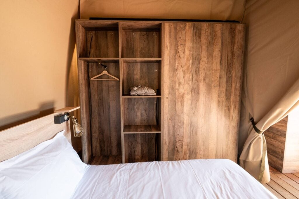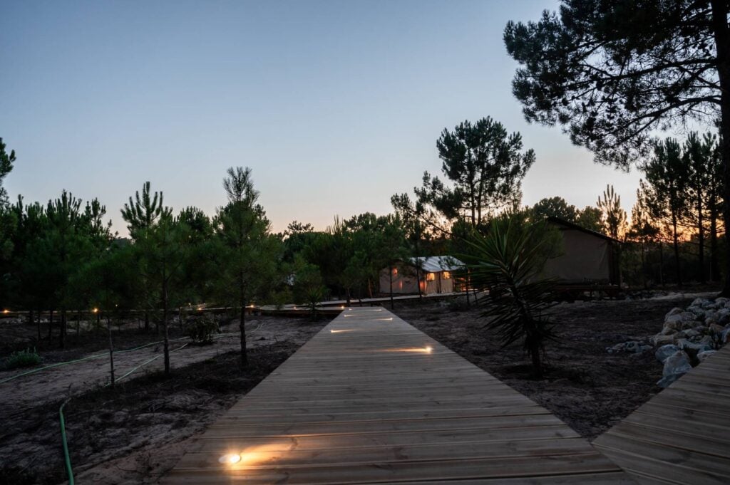 Em cada uma das sete tendas de glamping existem dois quartos com cama de casal, casa de banho completa e uma varanda panorâmica virada para a natureza.