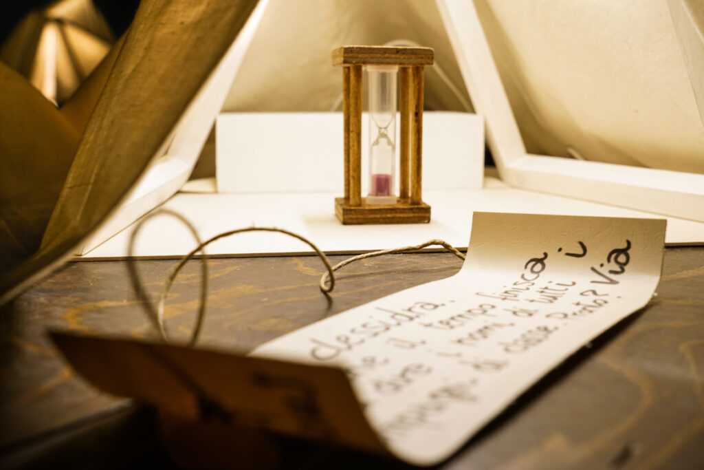 Um pequeno arquipélago composto por muitas ilhas: pequenas unidades espalhadas pelo chão/mar que podem acomodar apenas um sobrevivente de cada vez. À frente de cada Ilha, cada criança encontra uma mensagem com uma pergunta sugestiva ou um pedido simbólico. Algumas instalações antecipam o contacto, a manipulação, uma interação multissensorial ou tátil. Outros são apenas para contemplação, permitindo que aquilo que as crianças veem ou percecionam possa ser um estímulo para uma resposta ou um fluxo de palavras.
