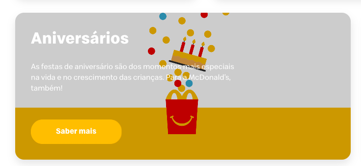 Tenham um dia inesquecível recheado de alegria e diversão, com jogos e desafios cheios de emoção, deliciosos menus Happy Meal, bolo de aniversário e, claro, muitas outras surpresas!