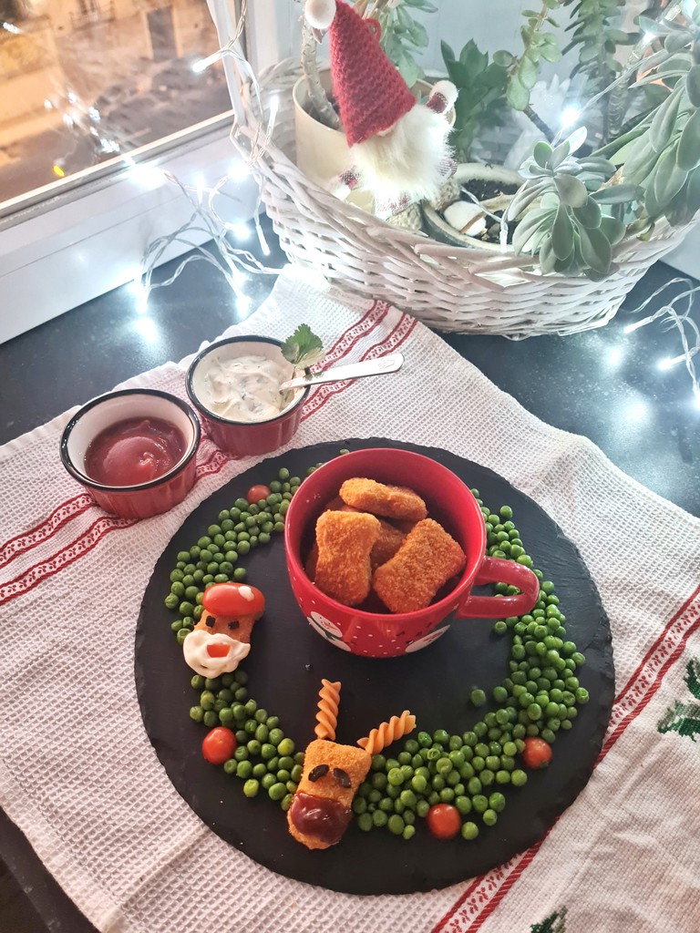 Esta receita de Nuggets com ervilhas é um prato delicioso, nutritivo e muito natalício! Podem fazer num instante e as crianças podem ajudar a decorar o Pai Natal e as renas!